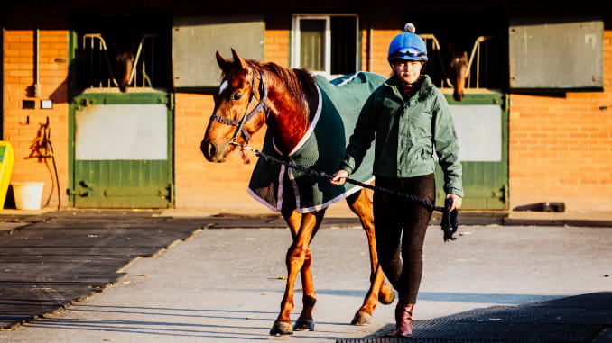 Rockstar Icon being led out to the gallops at Whatcombe Stables